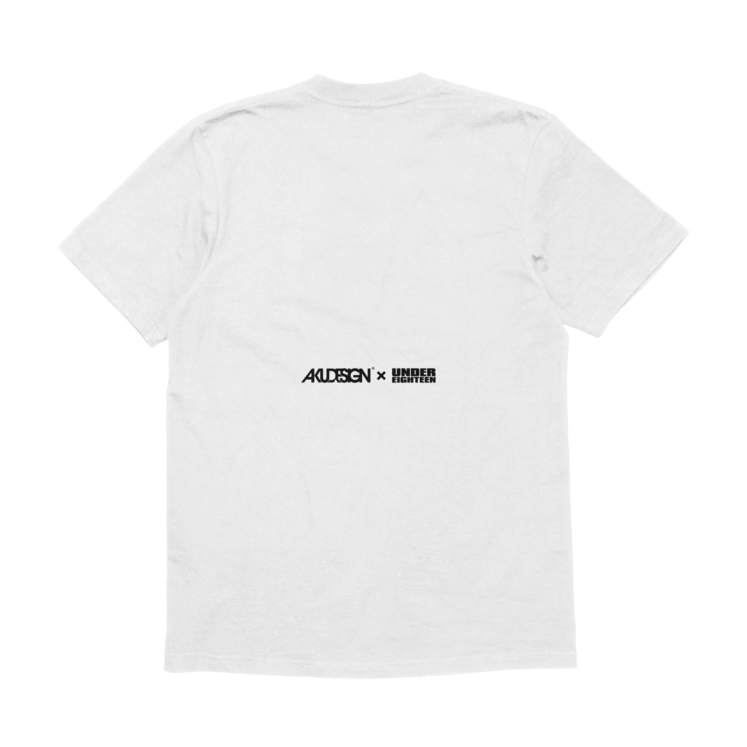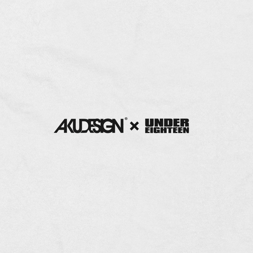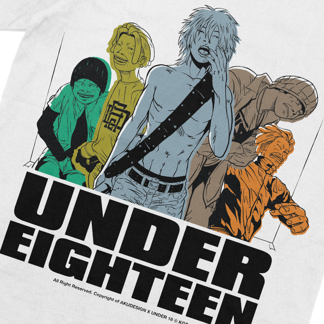 AKUUNDER18 Forefront, made from high-quality 20s cotton combed material, specially customized for the second Akudesign x Under 18 collaboration! Featuring a white base and a regular cut, this piece showcases large-scale prints of the main Under 18 characters Ax, Yoshi, and Kaio on the front, with the Akudesign x Under 18 collaboration logo on the back. Printed using the plastisol discharge method, it also includes additional details such as a Mono Flip woven label, Akudesign Emblem woven tag, custom Akudesign back tape on the inner collar, and a product label inside.
