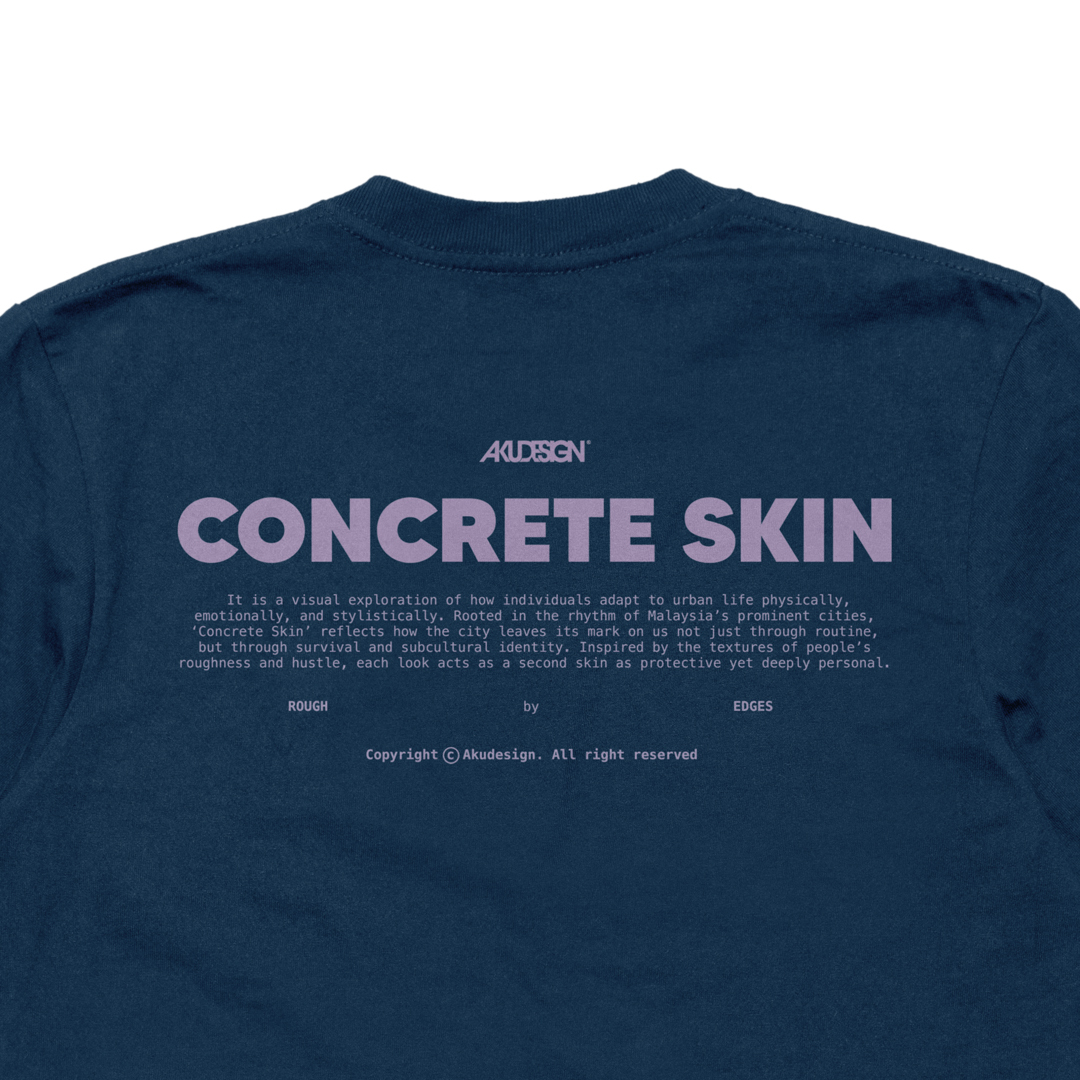 This piece features the iconic Akudesign Mono Logo on the front, and a bold "Concrete Skin" definition print on the back.