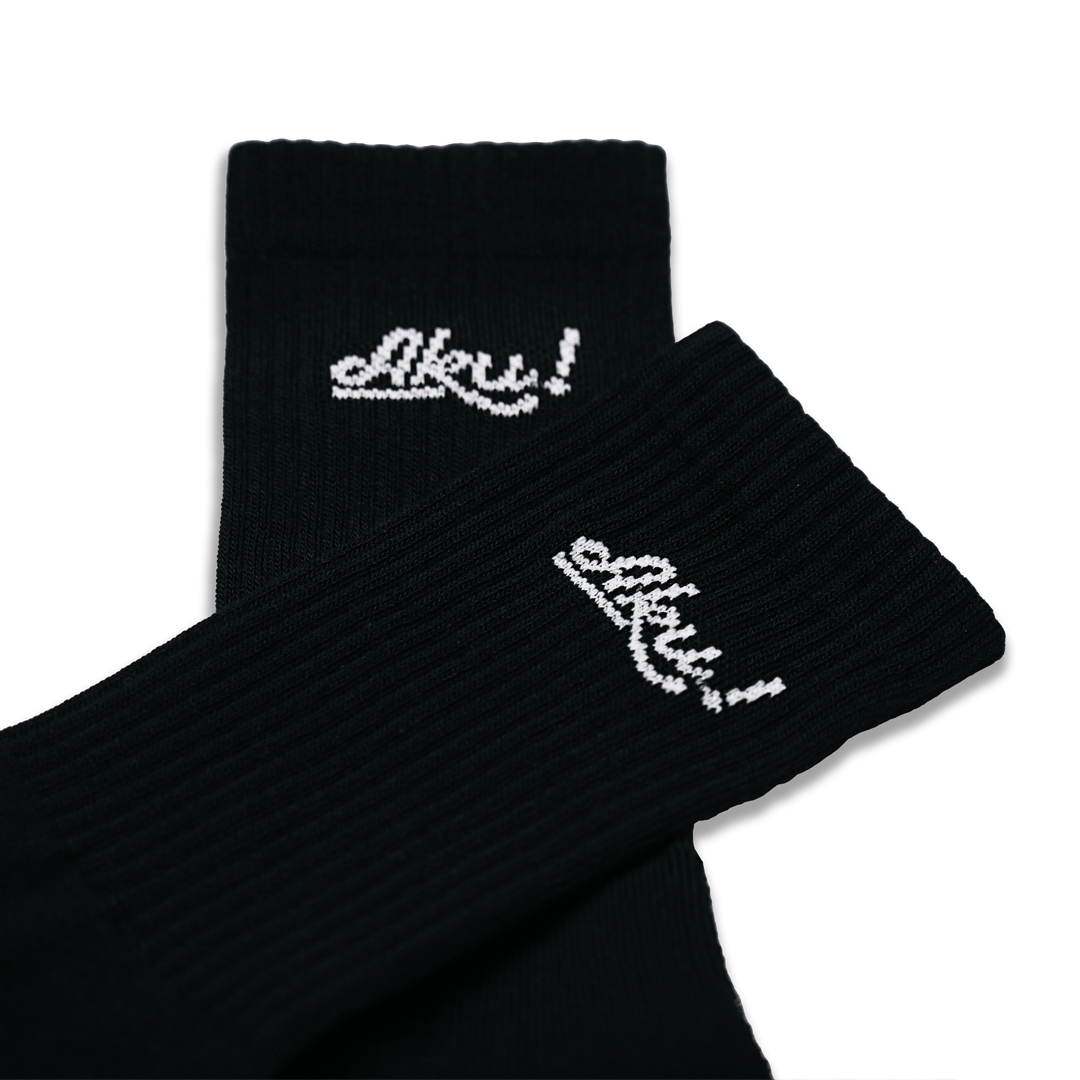 Built on a clean black base, the design features the bold “Aku” lettering placed on the side calf, delivering a sharp, minimal statement that hits different when styled with shorts or stacked bottoms.