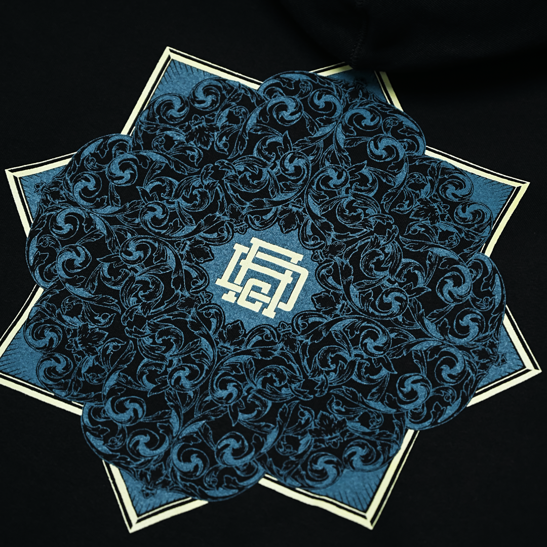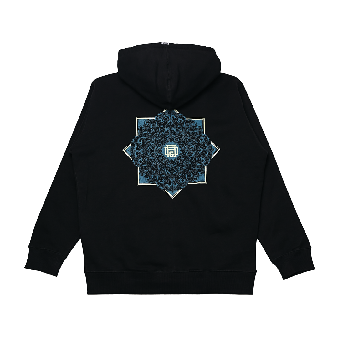 Fronted with the clean “Aku” typography logo and backed by large scale Akudesign signature ornament patterns, printed using the plastisol discharge method for a soft yet striking finish, this hoodie turns heads from every angle.