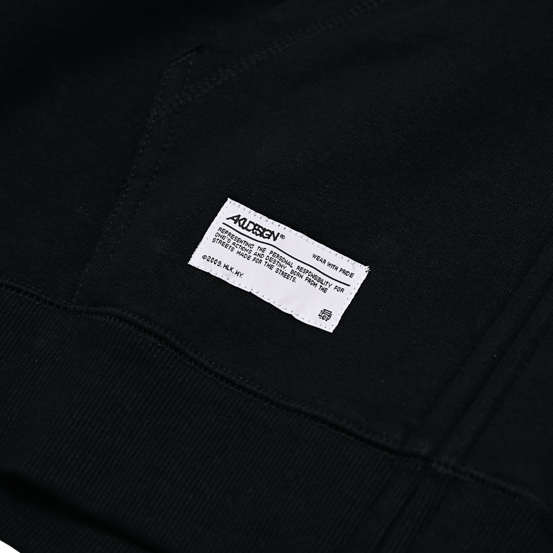 Every detail speaks Akudesign, Emblem Flip Woven Tag at the hood, Emblem Woven Tag at the collar, Woven Tag at the bottom front pocket, Product label & washing instructions inside.