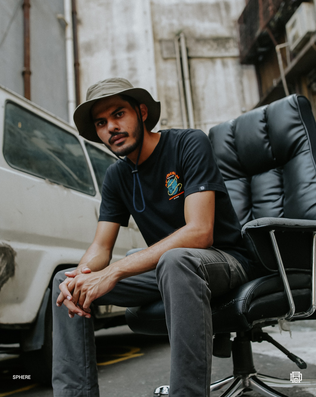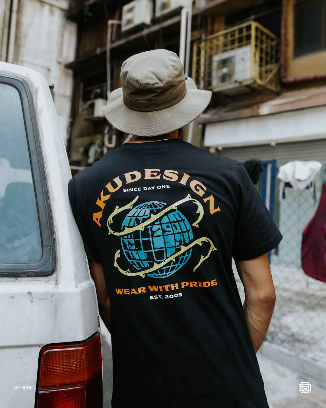 Akudesign Sphere Tshirt, made from 20s cotton combed black material. A large scale of graphic design printed on both front and back side of the tshirt, a combination of blue, orange, and mustard on a black base. Printed using silk screen plastisol discharge printing method, have high quality of detailing such as Mono Flip woven, Akudesign printed size label, customize Akudesign back tape at the collar, and product label on the inside. Grab it now, try it out, and always Wear With Pride!